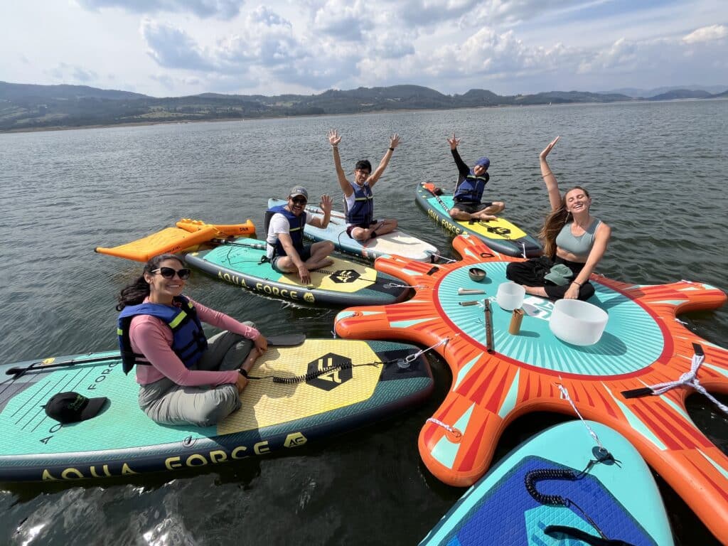 Imagina remar sobre el Embalse del Tominé, sintiendo la calma del agua y el viento en el rostro, haces una pausa en una isla flotante, compartes un snack, te ríes, tomas fotos y simplemente disfrutas el momento; Al final te espera un almuerzo delicioso y un cóctel con vista al paisaje. Este plan no es solo una salida, es una experiencia para desconectarte, recargar energía y vivir algo que recordarás por mucho tiempo.